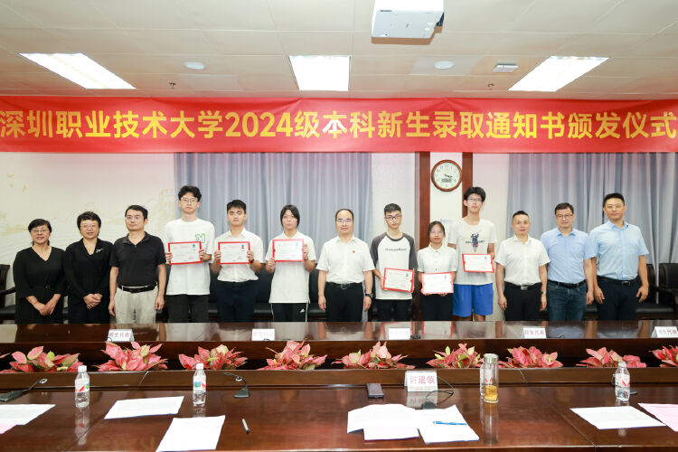 7月30日下午,深圳职业技术大学(以下简称“深职大”)2024级本科新生录取通知书颁发仪式在校内举行。学校党委副书记、校长许建领,相关职能部门及二级学院主要负责人及6名来自广州市第六中学、深圳实验学校高中部、深圳外国语学校、深圳市高级中学、深圳市福田区红岭中学等学校的新生代表参加仪式。许建领为新生代表颁发录取通知书并送上寄语,学校招生就业办公室副主任崔莲主持仪式。