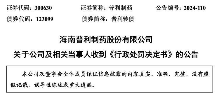 普利制药(300630)公告,公司及相关当事人收到海南证监局下发的行政处罚决定书,因未按期披露2023年年度报告,海南证监局决定对普利制药给予警告,并处以100万元罚款;对董事长、总经理范敏华给予警告,并处以40万元罚款;对董事、副总经理、财务总监罗佟凝给予警告,并处以30万元罚款。