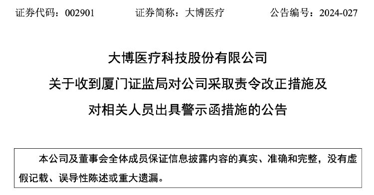 大博医疗(002901)公告,近日,公司及相关人员收到厦门证监局出具的行政监管措施决定书。因关联人名单及关联关系披露不完整、信息披露事务内部管理不规范、内幕信息知情人登记管理制度执行不到位、闲置募集资金使用不规范、年度报告信息披露存在简单错误等,厦门证监局决定对大博医疗采取责令改正的监督管理措施,对董事长林志雄、总经理罗炯、董秘华贤楠、财务总监陈丹荷采取出具警示函的监督管理措施,并记入诚信档案。