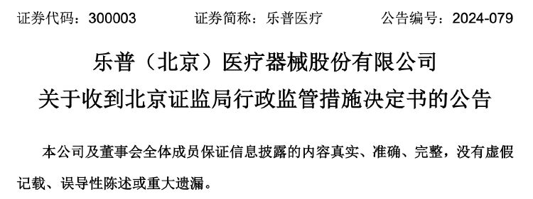 北京证监局决定对乐普医疗采取责令改正的行政监管措施,并记入证券期货市场诚信档案。