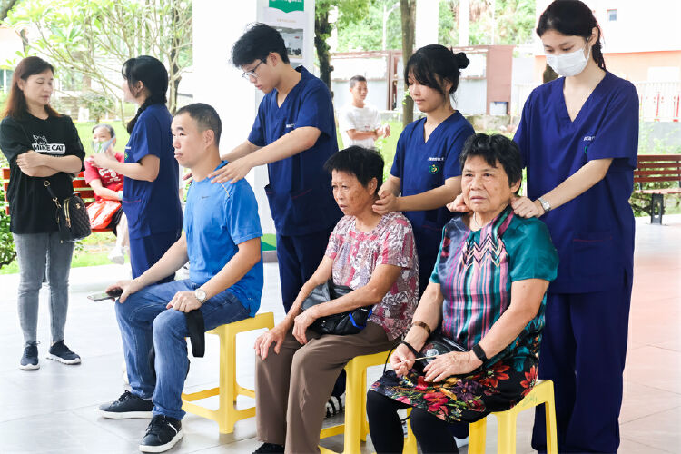 医护学院现场提供测血压、测血糖、耳穴压豆及推拿按摩等服务。