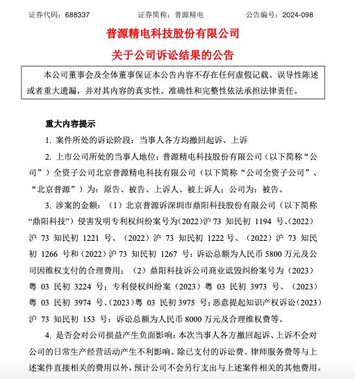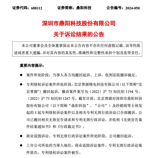 10月23日晚间,深圳市鼎阳科技股份有限公司(以下简称“鼎阳科技”)发布关于诉讼结果的公告。公告称,公司与北京普源精电科技有限公司(以下简称“北京普源”,其为上市公司普源精电科技股份有限公司全资子公司)达成和解,相关的专利侵权诉讼及商业诋毁诉讼已全部撤回。截至目前,北京普源对公司及经销商等主体发起的5起专利侵权诉讼案件以及相关专利无效行政诉讼已全部撤诉。公司已撤回相关无效宣告请求和专利无效行政诉讼,并收到《无效宣告案件结案通知书》和《行政裁定书》。当日,普源精电也发布了关于公司诉讼结果的公告,内容与鼎阳科技公告大致一致。