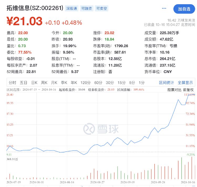 二级市场上,截至10月16日收盘,拓维信息报21.03元/股,相较8月21日收盘低点的9.48元/股,涨幅超过120%,最新总市值264亿元。