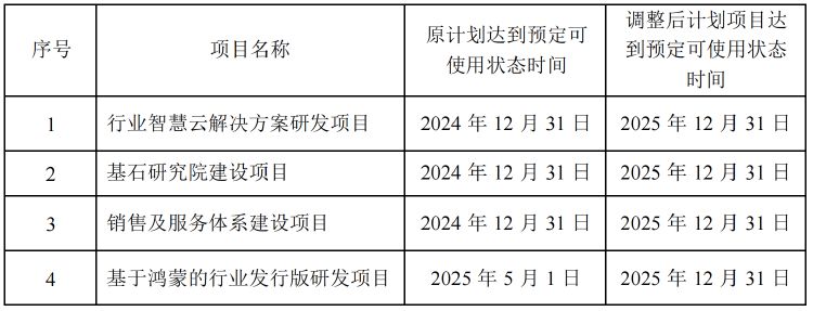 拓维信息表示,受社会经济、宏观环境等客观因素的影响,公司行业智慧云解决方案研发项目、基石研究院建设项目、销售及服务体系建设项目和基于鸿蒙的行业发行版研发项目在设备采购、人员投入等各方面受到了一定程度上的制约,预计无法在原计划的时间内达到预定可使用状态。