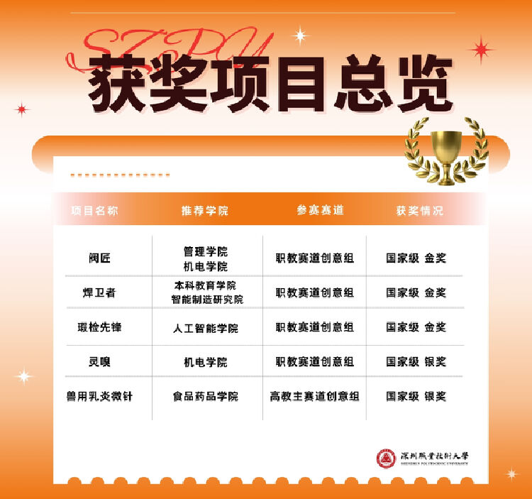 在10月12至15日举办的中国国际大学生创新大赛(2024)中,深圳职业技术大学(以下简称“深职大”)共获得3金2银的好成绩。学校在国家级创新创业大赛中累计已获得15金11银,继续领跑全国职业院校金牌榜和奖牌榜。
