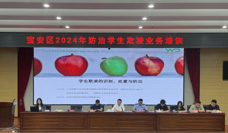今年,教育部办公厅印发通知,对各地开展校园暴力与学生欺凌防范治理专项行动提出新要求,指出各地要面向所有教职员工和家长定期开展学生欺凌防治专题培训,提升识别、应对能力以及干预处置水平。为落实通知精神,近日,深圳市宝安区司法局联合宝安区教育局、市公安局宝安分局共同举办首场教职工赋能培训,宝安各学区教育办相关负责人参加线下培训,全区中小学校长、法治副校长(法治辅导员)、安全教师、德育教师等教育工作者线上聆听互动。