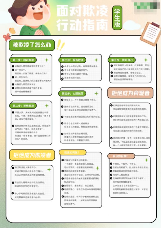 刘律师指出,学生欺凌不仅局限于肢体欺凌,还包括言语欺凌、网络欺凌、社交欺凌等多种形式,强调及时干预和妥善处理是防止欺凌事件进一步恶化的关键,在欺凌萌芽过程中,采用“教育为主+惩戒为辅+家长配合”等方式干预,要充分发挥教师关键作用,让每一名青少年都能在法治的阳光下健康成长。