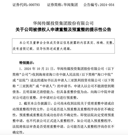 10月21日晚间,华闻传媒投资集团股份有限公司(以下简称“华闻集团”或“公司”)发布关于公司被债权人申请重整及预重整的提示性公告。公告称,2024年10月21日,华闻集团收到海南省海口市中级人民法院(以下简称“海口中院”或“法院”)送达的通知书以及申请人三亚凯利投资有限公司(以下简称“三亚凯利”或“申请人”)的申请书,申请人以公司不能清偿到期债务,且明显缺乏清偿能力,但具备重整价值为由,向海口中院申请对公司进行重整,并申请对公司进行预重整。