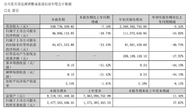 其中,第三季度营收为9.31亿元,同比下降7.16%;净利润为0.47亿元,同比降18.74%。