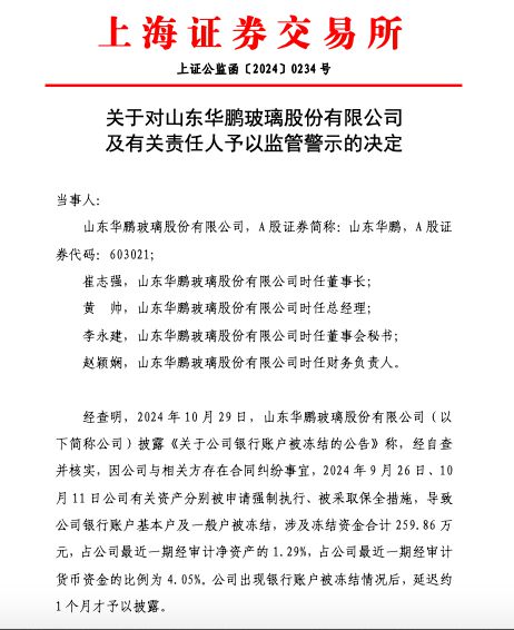 上交所相关决定称,经查明,2024年10月29日,山东华鹏玻璃股份有限公司(以下简称公司)披露《关于公司银行账户被冻结的公告》称,经自查并核实,因公司与相关方存在合同纠纷事宜,2024年9月26日、10月11日公司有关资产分别被申请强制执行、被采取保全措施,导致公司银行账户基本户及一般户被冻结,涉及冻结资金合计259.86万元,占公司最近一期经审计净资产的1.29%,占公司最近一期经审计货币资金的比例为4.05%。公司出现银行账户被冻结情况后,延迟约1个月才予以披露。
