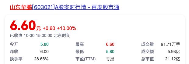 ▲10月30日,山东华鹏收报6.60元/股,总市值21.12亿元。