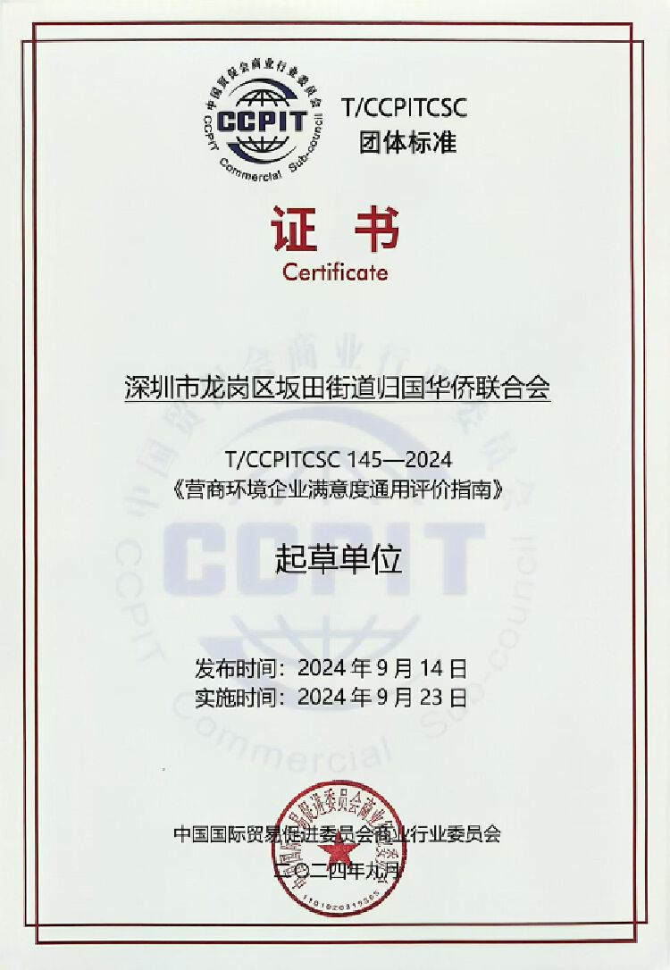 近日,坂田街道归国华侨联合会(以下简称“坂田侨联”)作为首个街道级别的“国字号”营商环境监测站,再次传来喜讯。侨联凭借其深厚的行业积淀和丰富的实践经验,成功参与了中国贸促会商业行业委员会的团体标准——T/CCPITCSC 145-2024《营商环境企业满意度通用评价指南》的起草工作,此项标准是国家标准委的国家级试点项目——“营商环境监测与企业综合服务标准化”的重点研制内容之一。