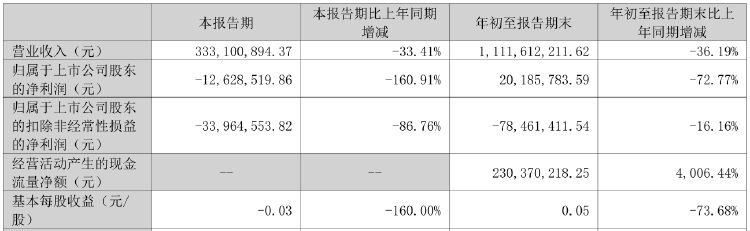 按单季度来看,公司今年第三季度实现营收3.33亿元,同比下降33.41%;归母净利润亏损1262.85万元,同比由盈转亏。