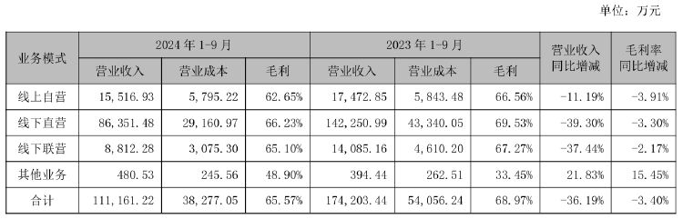 分业务来看,今年1~9月,迪阿股份线上自营、线下直营、线下联营、其他业务分别实现营业收入1.55亿元、8.64亿元、8812.28万元、480.53万元,较上年同期同比增减分别为-11.19%、-39.30%、-37.44%、21.83%。