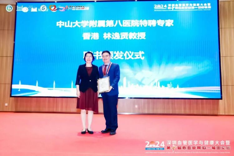 开幕式上,中大八院陈燕铭院长为来自香港亚洲心脏中心的林逸贤教授颁发“中山大学附属第八医院特聘专家”聘书