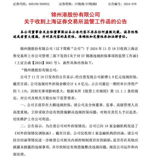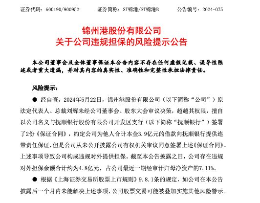 11月18日晚间,锦州港股份有限公司(以下简称“ST锦港”或“公司”)发布关于公司违规担保的风险提示公告。公告称,前期公司向与公司存在合作关系的19家金融机构分别发送了《对外担保情况调取函》,截至本公告披露日,公司已收到5家金融机构的回函。根据抚顺银行的回函,于2024年5月22日,公司原法定代表人、总裁刘辉未经公司董事会、股东大会审议决策,超越其权限,擅自以公司名义与抚顺银行股份有限公司开发区支行签署了2份《保证合同》,约定公司为他人合计本金3.9亿元的借款向抚顺银行提供连带责任保证,但是公司从未公开披露公司有权机关审议同意签署上述《保证合同》。上述事项导致公司构成违规对外提供担保。截至本公告披露之日,公司存在违规对外担保余额合计约为4.8亿元,占公司最近一期经审计归母净资产的7.11%。当日,上海证券交易所下发监管工作函,要求ST锦港要求公司立即采取合法有效措施解决违规担保问题,对相关责任人予以追责。