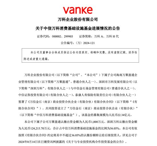 万科下属子公司万聚盈通认缴出资金额为人民币1,000万元、深圳万科认缴出资金额为人民币124,215.70万元,合计占中信万科消费基础设施基金的比例为56.05%。本公司有权按照《有限合伙合同》约定将其中不超过36.05%的认缴份额转让给后续投资人。