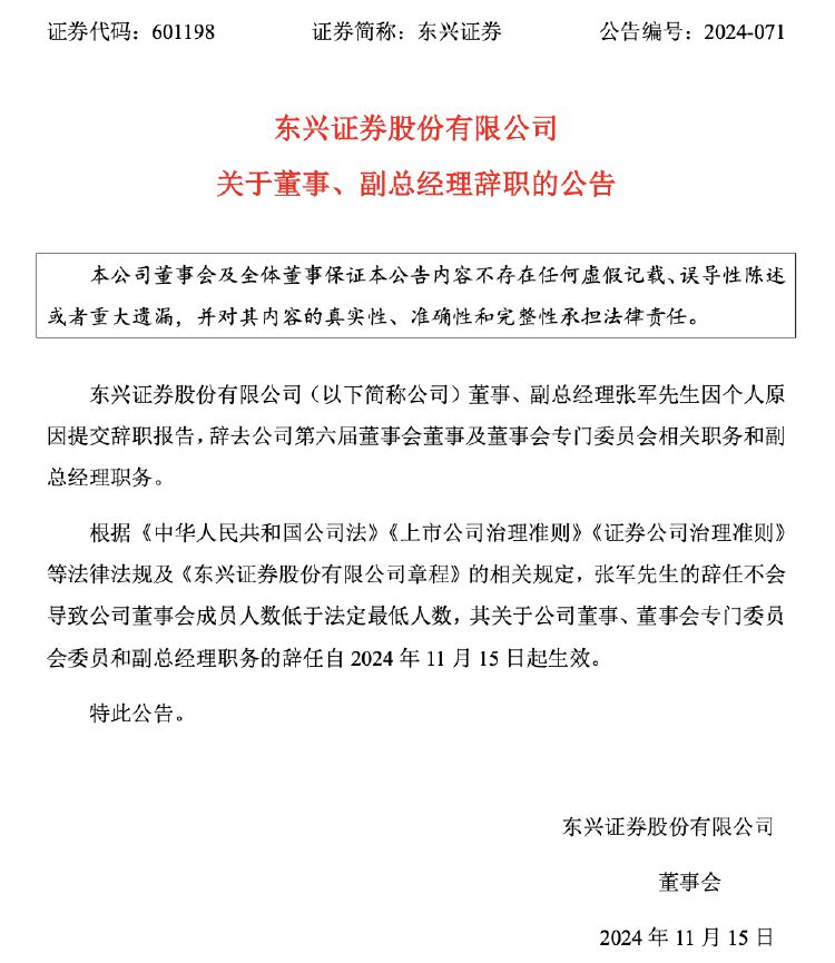 东兴证券称,张军的辞任不会导致公司董事会成员人数低于法定最低人数,其关于公司董事、董事会专门委员会委员和副总经理职务的辞任自2024年11月15日起生效。