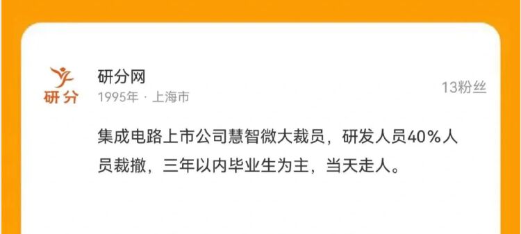 近日,射频芯片厂商慧智微(688512)被爆料年底大裁员,有“研发裁员达40%、赔偿为N+1、一天内全部走人”等消息传出,引发投资者们的关注。深圳商报·读创客户端记者就此事询问慧智微相关负责人,得到回复称,大规模裁员为不实信息,公司根据目前行业发展情况,对团队架构进行了小范围的调整。