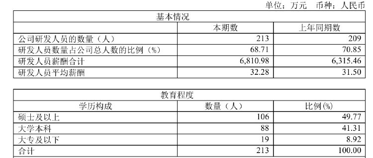 半年报显示,慧智微今年上半年研发人员的数量为213人,占公司总人数的68.71%,学历为大学本科及以上占比超九成,薪酬合计6810.98万元。