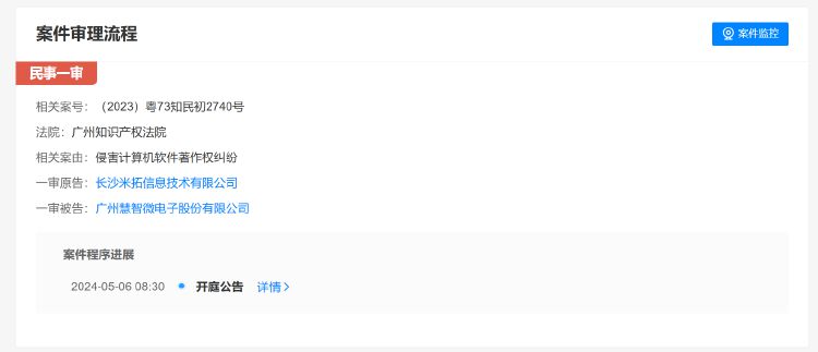 据天眼查APP,慧智微今年5月新增一条民事案件,案由为侵害计算机软件著作权纠纷,案件身份为民事一审被告。