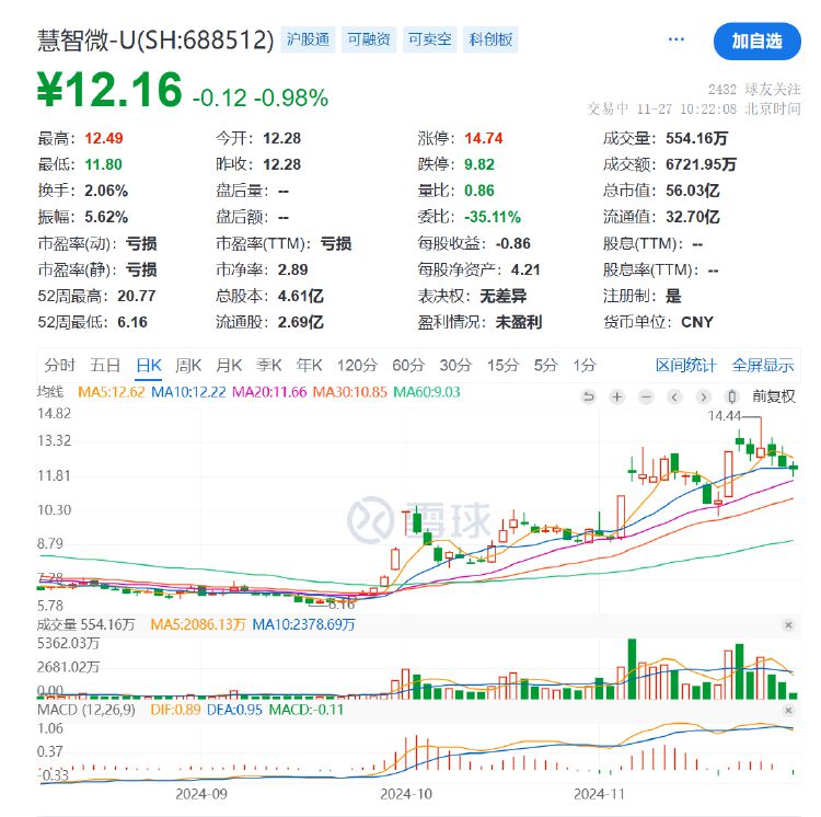 或受业绩影响,慧智微在二级市场上的表现也不容乐观。2023年5月16日,发行价为20.92元的慧智微上市就破发,盘中跌超11%,此后震荡走低。截至27日10点22分,慧智微跌0.981%报12.16元/股,上市以来跌超41%。