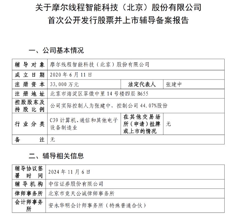 11月13日据证监会官网最新信息显示,国产GPU公司摩尔线程智能科技(北京)股份有限公司(简称“摩尔线程”)在北京证监局办理辅导备案登记,正式启动A股上市辅导,辅导机构为中信证券。