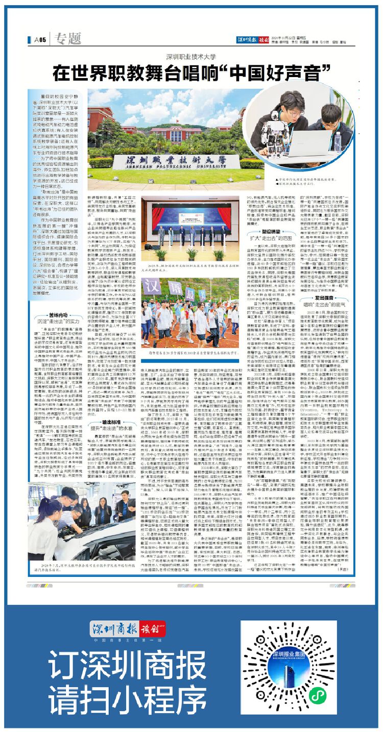 像这样的“走出去”,是深职大代表中国亮相世界职教舞台的重要举措。目前,学校已在德国、保加利亚、澳大利亚、巴西、芬兰等10个国家设立13个深圳数字工坊(职业教育培训中心),推动23项“中国标准”走出去。未来,学校还将充分发挥我国在5G、新能源汽车、无人机等领域的领先优势,联合相关企业强化“职教出海”,将企业技术标准、产品标准转变成课程标准、培训标准,探索与中国企业和产品“走出去”相配套的职业教育发展模式。