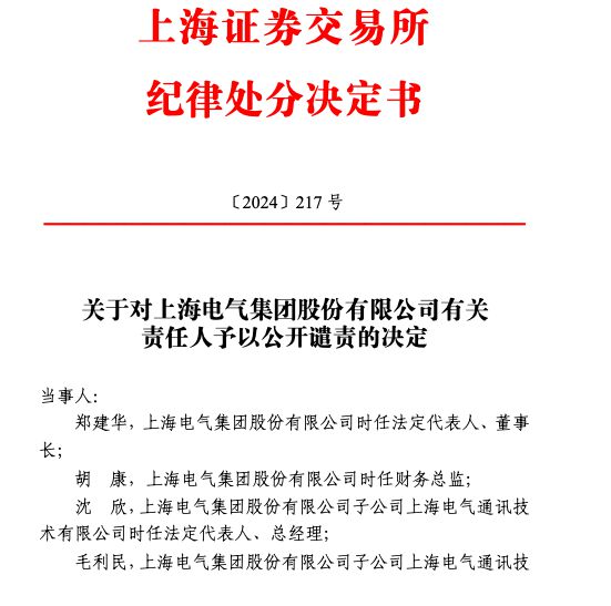 对上海电气集团股份有限公司时任法定代表人、董事长郑建华,时任财务总监胡康,电气通讯时任法定代表人、总经理沈欣,电气通讯时任财务总监毛利民予以公开谴责。