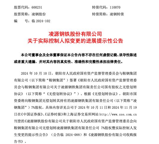 11月18日盘后,凌源钢铁股份有限公司(以下简称“凌钢股份”或“公司”)发布关于实际控制人拟变更的进展提示性公告。公告透露,11月18日,公司收到鞍钢集团有限公司(以下简称“鞍钢集团”)《告知函》:10月12日,鞍钢集团已按照相关规定向国务院国资委报送凌钢集团7%股权无偿划转请示,截至11月18日,尚未获得国务院国资委批复,凌钢集团7%股权过户事项尚在有序进行中。