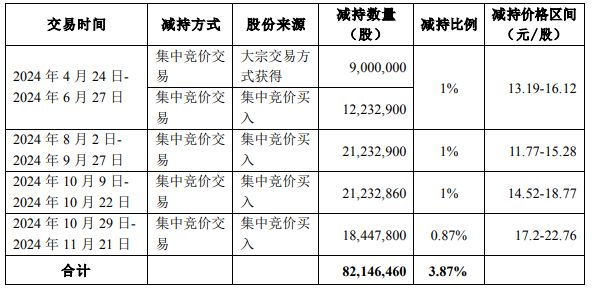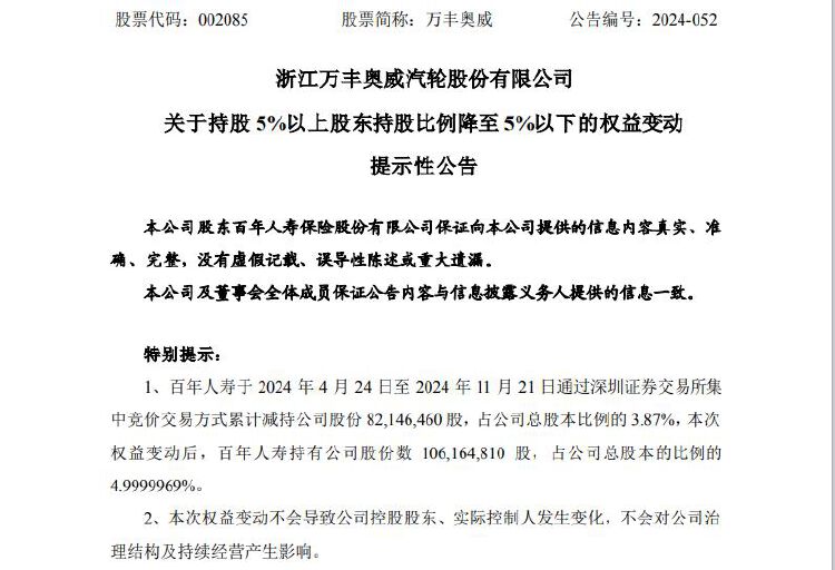万丰奥威(002085)昨晚发布提示性公告称,公司险资股东百年人寿保险在2024年4月24日至2024年11月21日通过集中竞价交易方式累计减持公司股份8215万股,占公司总股本的3.87%。权益变动后,百年人寿持有公司股份1.06亿股,占公司总股本的比例为4.9999969%。这意味着,百年人寿若后市继续减持万丰奥威时,可以不必公告了。