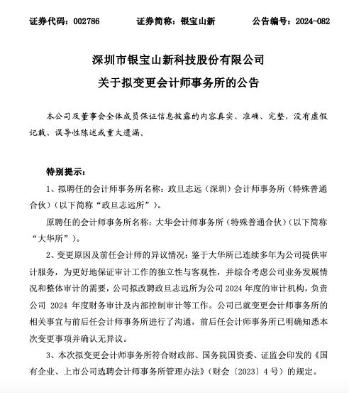 11月19日盘后,深圳市银宝山新科技股份有限公司(以下简称“银宝山新”或“公司”)关于拟变更会计师事务所的公告。公告透露,鉴于大华会计师事务所(特殊普通合伙)(以下简称“大华所”)已连续多年为公司提供审计服务,为更好地保证审计工作的独立性与客观性,并综合考虑公司业务发展情况和整体审计的需要,公司拟改聘政旦志远(深圳)会计师事务所(特殊普通合伙)(以下简称“政旦志远所”)为公司2024年度的审计机构。这也是自11月10日以来,大华所失去的第33个客户。