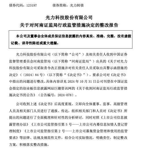 10月31日,光力科技发布关于收到河南证监局行政监管措施决定书的公告。因上述违规行为,根据《上市公司信息披露管理办法》(证监会令第182号)第五十二条等规定,河南证监局决定对公司采取责令改正的行政监管措施,对赵彤宇、贾昆鹏、曹伟采取出具警示函的行政监管措施,并记入证券期货市场诚信档案。