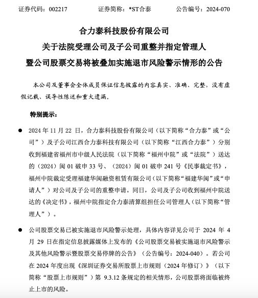 11月24日,合力泰科技股份有限公司(以下简称“*ST合泰”或“公司”)发布关于法院受理公司及子公司重整并指定管理人暨公司股票交易将被叠加实施退市风险警示情形的公告。公告称,2024年11月22日,公司及江西合力泰科技有限公司(以下简称“江西合力泰”)收到福州中院的《民事裁定书》,裁定受理福建华闽融资租赁有限公司(以下简称“福建华闽”或“申请人”)对公司及子公司的重整申请。同日,公司及子公司收到福州中院送达的《决定书》,指定合力泰清算组担任公司管理人。公司股票交易已被实施退市风险警示处理。