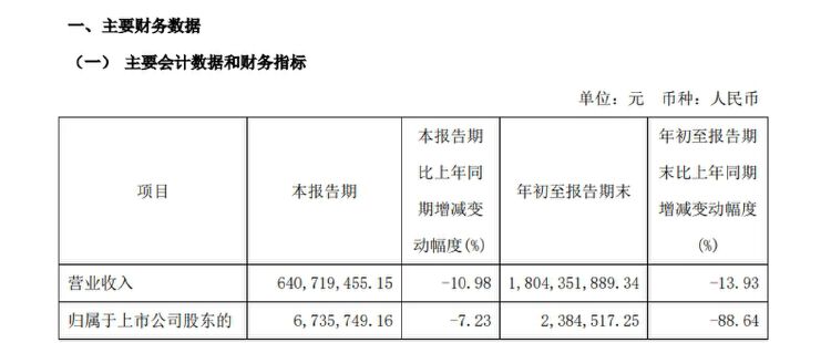 财报显示,今年前三季度,公司实现营业收入18.04亿元,同比下降13.93%;归母净利润238.45万元,同比下降88.64%;扣非净利润-95.6万元,上年同期盈利1074.97万元,由盈转亏。