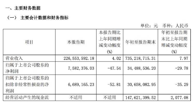 据福莱蒽特最新财报,2024年前三季度,公司营收7.35亿元,同比上涨7.97%;归母净利润0.34亿元,同比下滑29.78%。其中,第三季度实现营收2.27亿元,同比上涨4.02%;归母净利润758.24万元,同比接近腰斩。