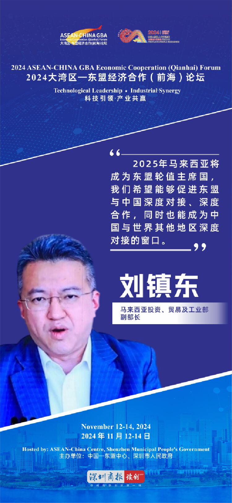 “今年是马来西亚与中国建交50周年,两国各个层级的对接紧密,举办的联合活动都非常重要。不单单只是马来西亚和中国的关系,东盟和中国的关系也非常重要。”马来西亚投资、贸易及工业部副部长刘镇东在2024大湾区—东盟经济合作(前海)论坛通过视频发表主旨发言,他表示,2025年马来西亚将成为东盟轮值主席国,我们希望能够促进东盟与中国深度对接、深度合作,同时也能够成为中国与世界其他地域深度对接的窗口。