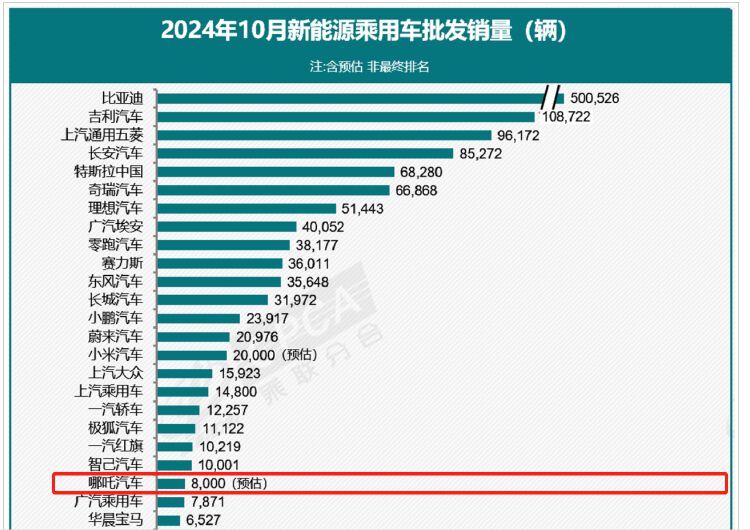 在市场同比环比均增长的情况下,哪吒汽车或交出本年度“最差”月度成绩单。11月11日,乘联分会发布最新零售销量数据统计,10月份新能源狭义乘用车销量119.6万辆,同比增长56.7%,环比增长6.4%。乘联会11月4日曾披露,预估哪吒汽车的10月批发销量为8000辆,其此前的月度销量基本超过1万辆。