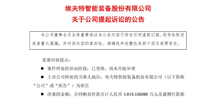 11月7日,A股上市公司埃夫特(688165)发布公告称,因合众新能源宜春分公司的车身车间设备总承包项目、滚边岛和焊接岛项目、自动化焊装线项目按约全部验收完成,合众新能源宜春分公司对合同剩余价款逾期支付,公司作为原告,对合众新能源向江西省宜春市袁州区人民法院提起诉讼。