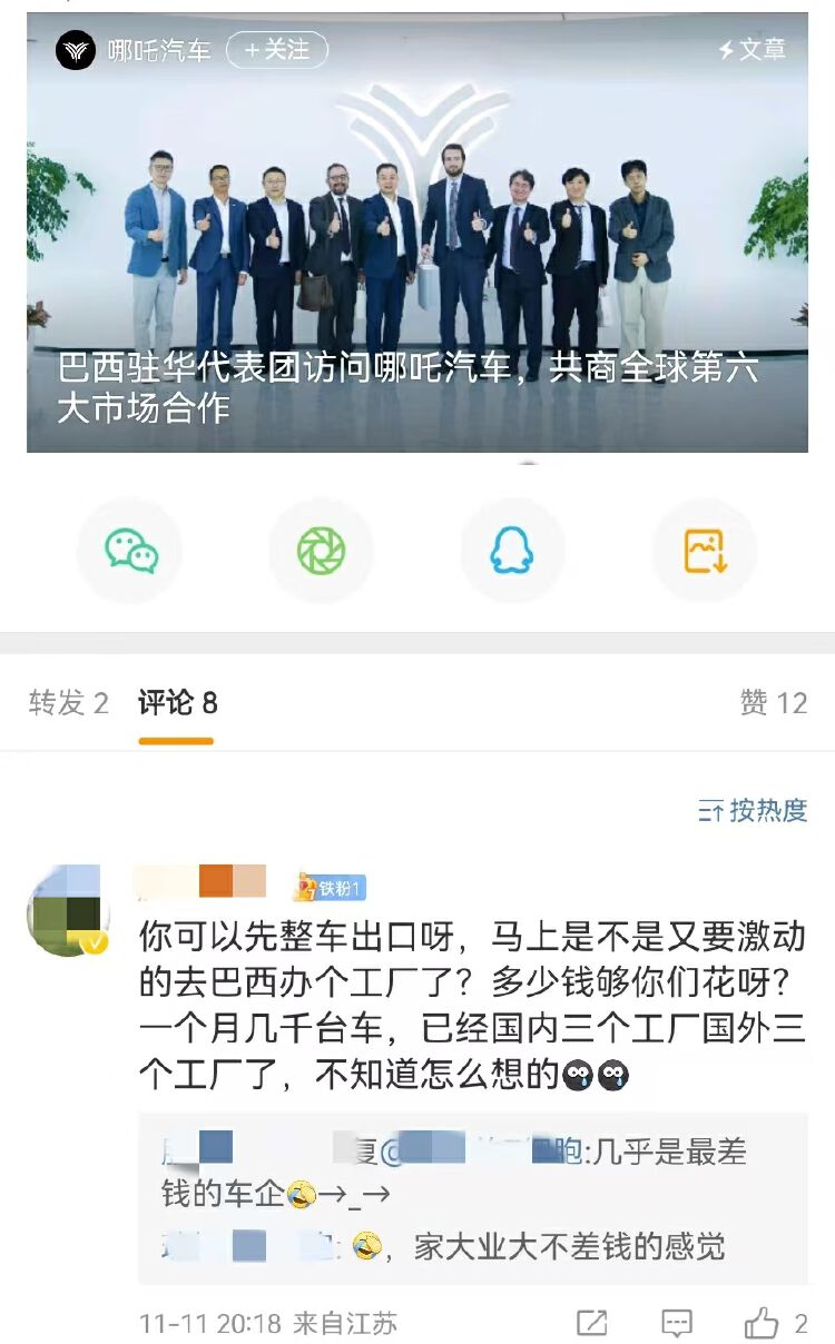 11月11日,哪吒汽车发消息称,公司和巴西驻华代表团共商全球第六大市场合作。但立马遭到网友的叩问:“是不是又要激动的去巴西办个工厂了?多少钱够你们花呀?”哪吒汽车近期在海外市场取得了一些成绩,哪咤X位居10月泰国市场纯电SUV上牌量第一。