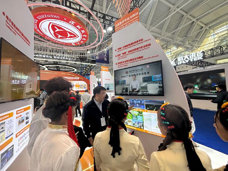 大会同期举办职业教育专题展。深职大共有两个展厅,分别是工程技术教育成果展和国际交流合作成果展。工程技术教育成果展通过八大板块集中呈现了学校多领域的创新成就,包括学校在锻造高素质技术技能人才中的卓越成就、在前沿技术探索中的强大实力、在助力产业转型升级的实践担当、在数字化教学领域的技术突破等。国际交流合作成果展通过深圳数字工坊、职业教育国际期刊、联合国教科文组织职业技术教育数字化教席、“一带一路”职业教育国际研讨会、深圳协议等几大内容,展现了学校高质量职业教育国际化发展的实践与成果。两大展厅展现了深职大作为职业教育领航者的创新实践,为全球职业教育提供了鲜活的“中国范例”。学校展厅是专题展中关注度最高的展厅之一,众多国内外嘉宾参观学校展厅,了解学校办学成果。