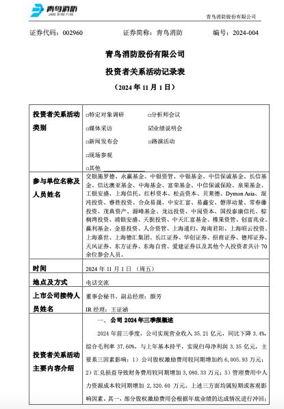 在11月1日的调研活动中,青鸟消防称,2024年前三季度,公司实现营业收入35.21亿元,同比下降3.4%,综合毛利率37.60%,与上年基本持平,实现归母净利润3.35亿元,主要系三因素影响:1)公司股权激励费用较同期增加约6,005.93万元;2)汇兑损益导致财务费用较同期增加3,080.33万元;3)管理费用中人力资源成本较同期增加2,320.60万元。上述三方面均属短期或客观影响因素。其一,部分股权激励费用会根据年底业绩的达成情况进行冲回;其二,汇兑损益属账面亏损存周期性波动且对公司实际经营无影响;其三,公司于行业出清期逆势扩张,旨在把握结构性机会进一步抢占市场份额,强化龙头地位,为公司长期发展及战略实施积累人才储备。