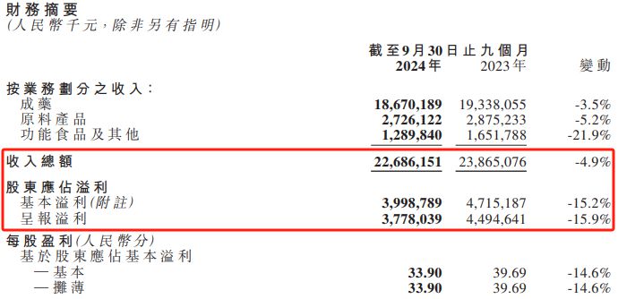 11月15日,石药集团(01093.HK)公布2024年前三季度业绩,录得营收、净利双下滑。