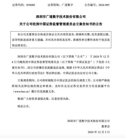 12月4日晚间,深圳市广道数字技术股份有限公司(以下简称“广道数字”或“公司”)发布关于公司收到中国证券监督管理委员会立案告知书的公告。